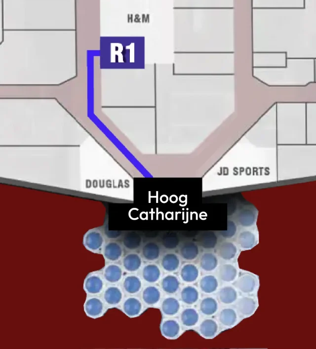 Loop naar het plein met het bollendak en ga daar Hoog Catharijne binnen. Loop richting H&M. Douglas zit aan je linker hand. Net voor de H&M rechts zit de entree van Connect Offices.